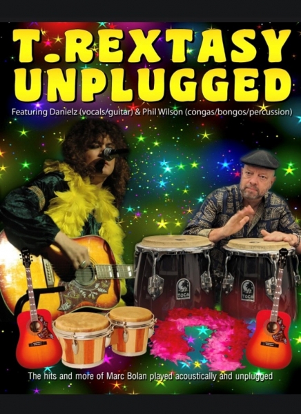 T.Rextasy ‘Unplugged’ brings you the songs of Marc Bolan played acoustically and sung by Danielz (lead singer and lead guitarist with T.Rextasy), accompanied by Phil Wilson (drummer with T.Rextasy) on congas and percussion. Tracks that many of you would have heard the band play electrically over the years, take on a new dimension and feel, giving the audience and musicians a more intimate and relaxed approach to the evening.